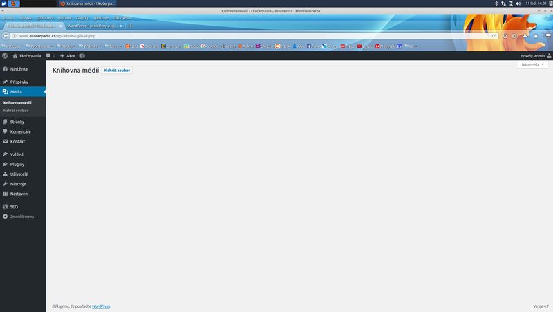 No tak jsem zkusil vypnout všechny pluginy a stránka médií se načetla. Postupně jsem zkusil zapínat pluginy a zároveň zkoušel funkčnost knihovny.Po zapnutí všech co jsem vypnul knihovna funguje. Tak to jsem z toho jelen, když jsem to dělal před tím než jsem psal dotaz tak to nešlo. Nicméně děkuji za reakci na můj dotaz do fora a příště to zkusím vícekrát.11. ledna 2017 (17:27) #30508:-) Těžko říci, vypadá to, že tam byla cachovaná starší verze skriptu? Problémy se objevily ve chvíli, kdy jste aktualizoval na nový WordPress 4.7? Potom si možná prohlížeč (Firefox) pamatoval starší verzi skriptu a načítal ji v kombinaci s novým WordPressem (i když k tomu by dojít asi nemělo). Nebo došlo i k aktualizacím pluginů a mohl se tam načítat nějaký starší skript nějakého pluginu (byl v konfliktu s novým WordPressem)? Podle mě už to bude v pořádku, jen přesnou příčinu se asi nedozvíme…